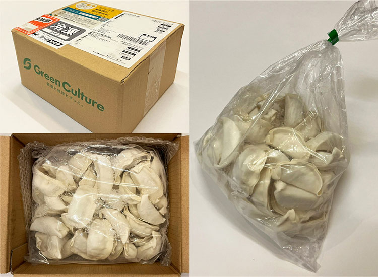 餃子に合わせた薄い箱で届きました!開けてみると、緑!頼んでいたからわかっていたものの、いざ目の前にするとインパクトがあります。今回唯一の色付き餃子です!皮の緑の正体はほうれん草が皮に練り込まれています。餃子梱包はこちらもビニール。あまり欠けているのは目立ちません。