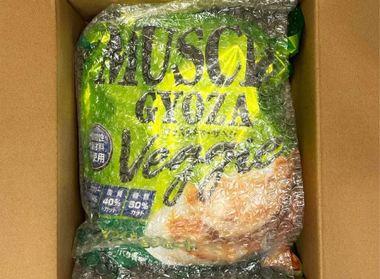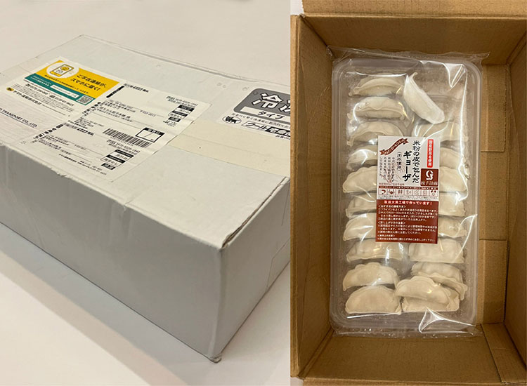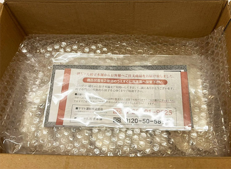 箱が大きく、開けてみると中がスカスカなのでパッケージの中で餃子が動いてしまっていました。同梱チラシに焼き方がイラスト付きで記載されているのは分かりやすくてありがたいです。