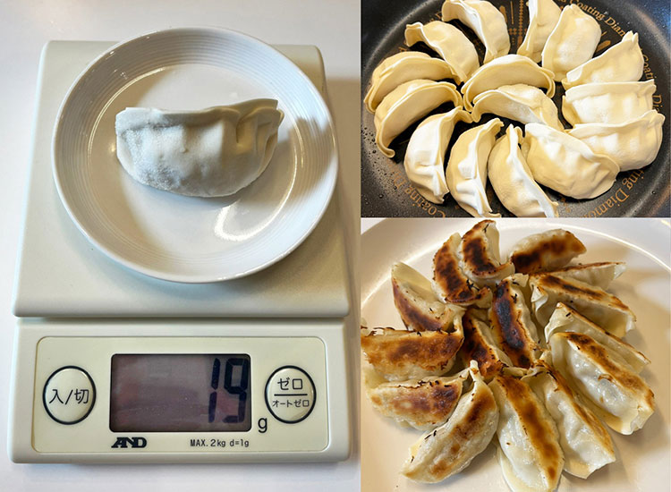 この餃子は1つ1つが大きいです!7種の中で一番の重量でした。皮に色がついているので、焼き色の判断難しいかなと思いましたが、綺麗に焼き色がつき、緑色が鮮やかな見た目になりました。
