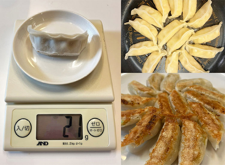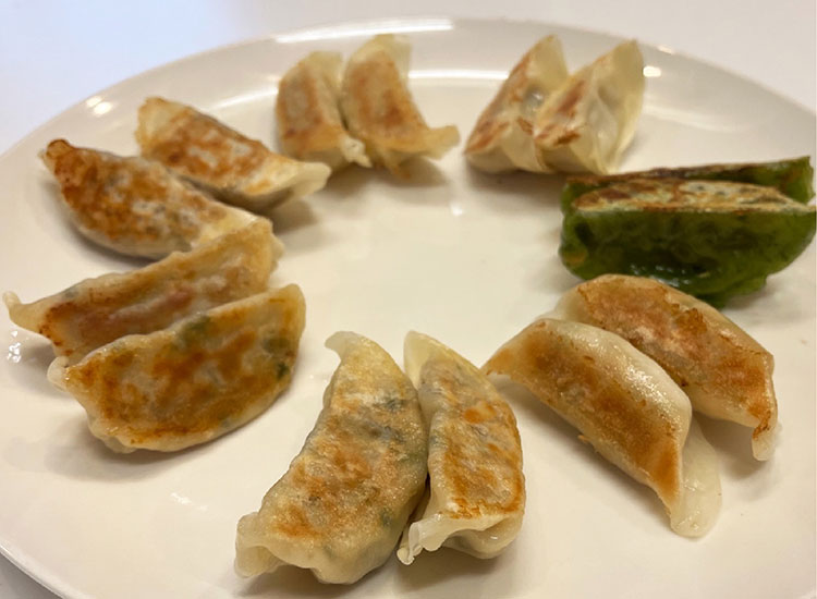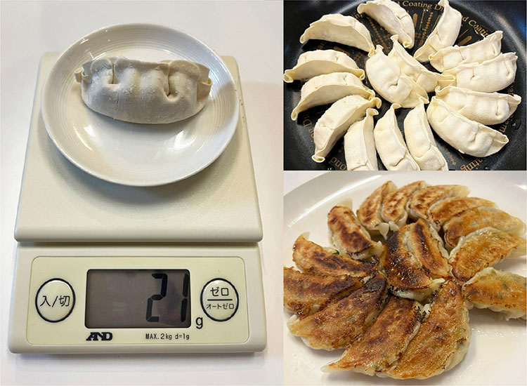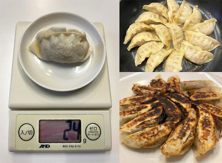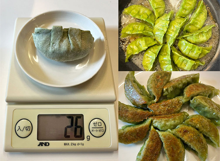 この餃子は1つ1つが大きいです!7種の中で一番の重量でした。皮に色がついているので、焼き色の判断難しいかなと思いましたが、綺麗に焼き色がつき、緑色が鮮やかな見た目になりました。