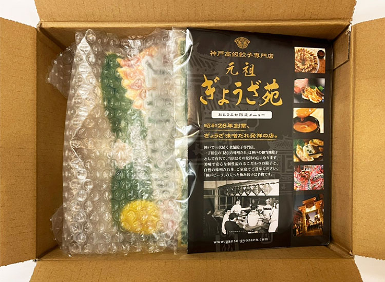 こちらも緩衝材に包まれています。一緒にお取り寄せ限定メニューも同梱されていました。神戸牛餃子や男の中の男のぎょうざと面白いネーミングのものもあり、どれも気になります。